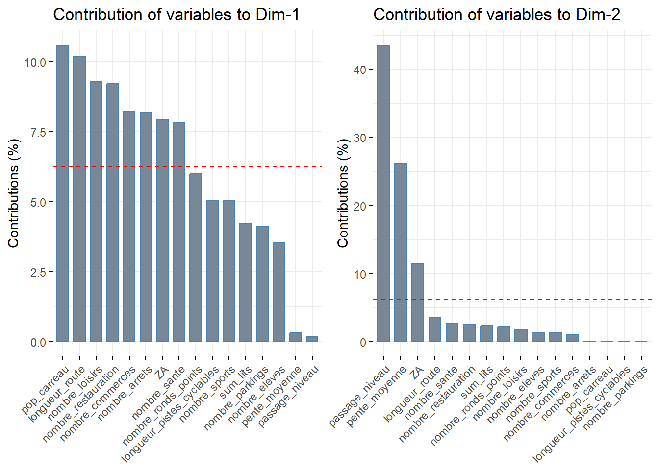 L’ACP à partir des données pédestres révèle que les deux premiers axes cumulent 58% de la variance totale, offrant ainsi une représentation significative des données originales. De cette première analyse nous conservons les valeurs suivantes, qui permettent d’accumuler plus de 50% de la variance expliquée pour chaque dimension : la population, la longueur des routes carrossables, le nombre d’arrêts de transport en commun, le nombre de commerces, le nombre de loisirs, le nombre de restaurants, la surface artificialisée et le nombre de passages à niveau.